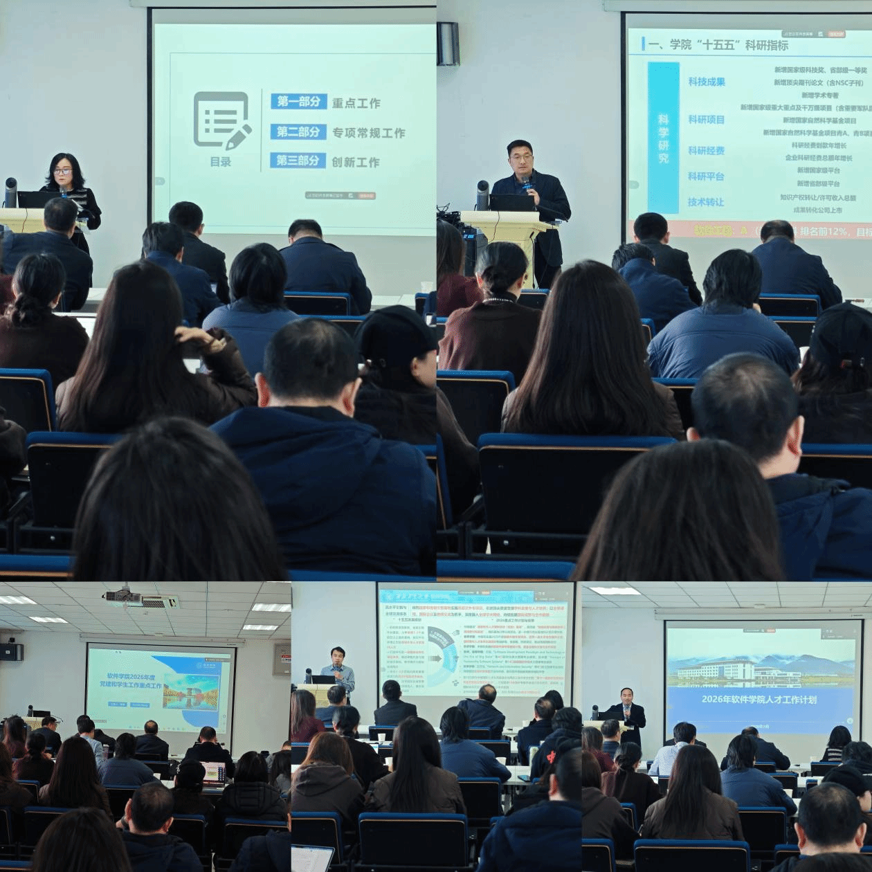 院长郑江滨在总结讲话中强调,全院要紧紧围绕学院“十五五”发展蓝图,以“六个明确”——即目标明确、任务明确、举措明确、人员明确、过程明确、奖励明确——系统推动各项工作落实。他指出,在目标上,必须奋力实现获评国家科技奖、国家教学成果奖、发表NCS论文,推动学科进入A类,提高“国字号”人才占比,新增科睿唯安科学家等标志性成果。在任务上,要聚焦三大核心:一是将师资队伍建设作为重中之重,持续扩大规模、优化结构;二是全面推进“软件*AI+X”为导向的人才培养体系改革,打造全国示范;三是着力补齐科研短板,重点突破高质量成果产出、高水平团队建设、高层次合作网络构建。在实施路径上,要坚持对外深化强强合作、对内推动团队聚力,全面革新教学体系,强化科研宣传与条件保障。郑江滨表示,全院教师是落实发展的主体,学院将贯彻“培优扶弱、突出亮点、守住底线”的工作原则,加强过程管理与正向激励,确保各项目标任务扎实推进、取得实效,共同开创学院事业发展新局面。
