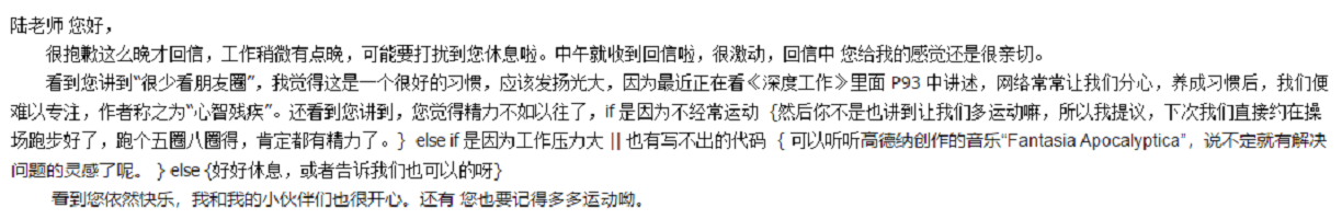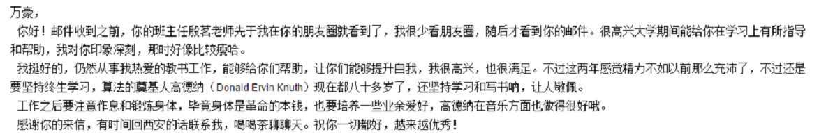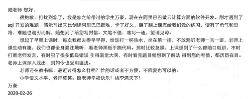 在收到来信后,陆伟老师与万豪同学又一来一往发送了回信。回信中,有叙旧、有分享、有勉励,生活很大,但因为三封信的“三次握手”变得温暖。