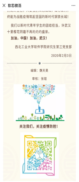 在这场防控疫情的斗争中,学生党支部充分发挥基层党组织战斗堡垒作用和党员先锋模范作用,先后以不同形式开展支部活动,积极宣传防控知识、交流学习经验、关心同学、坚决不信谣不传谣,以实际行动支持着这场战役。