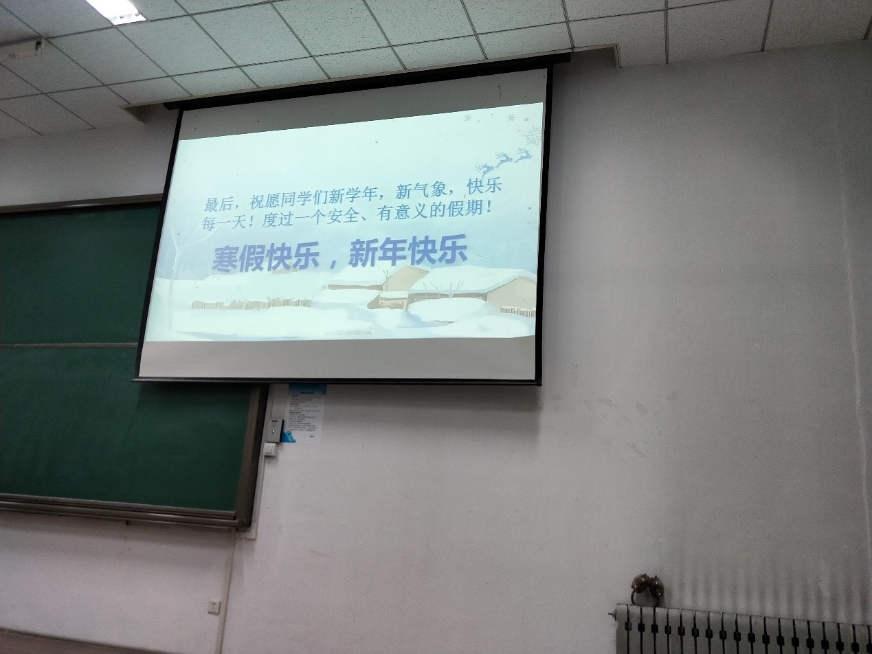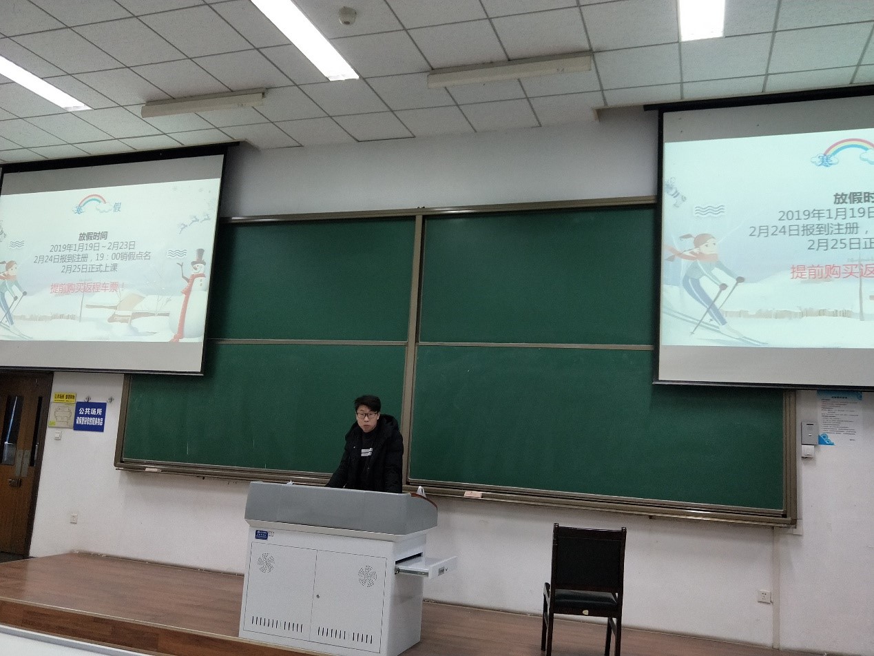 之后陈智通老师提醒同学们在寒假期间要多陪陪父母,去培养自己的兴趣爱好,加强身体锻炼,把寒假过得有意义。同时陈智通老师提醒所有同学大学时间即将过半,希望大家在寒假假期认真思考大学毕业之后的去向,与父母认真沟通交流。有挂科的学生假期以复习功课为主,好好学习,认真准备补考,为之后的学习打下坚实的基础!