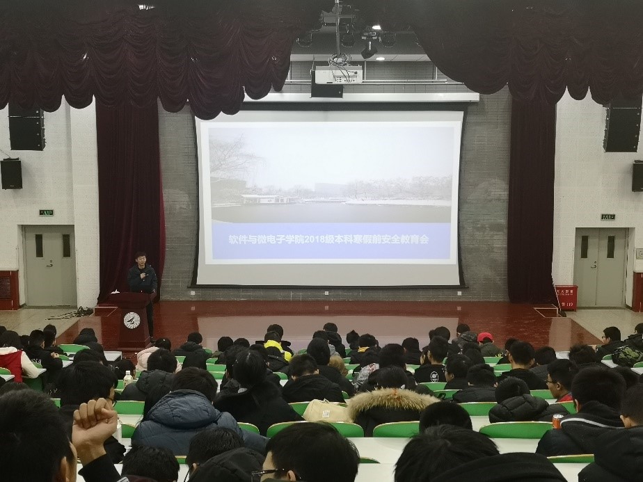 2019115日晚7点,本学期最后一门考试刚刚结束后,软件与微电子学院在教西A100报告厅召开了2018级本科寒假前安全教育大会。会议由2018级本科生辅导员樊超老师主持,2018级全体本科生参加了此次会议。
