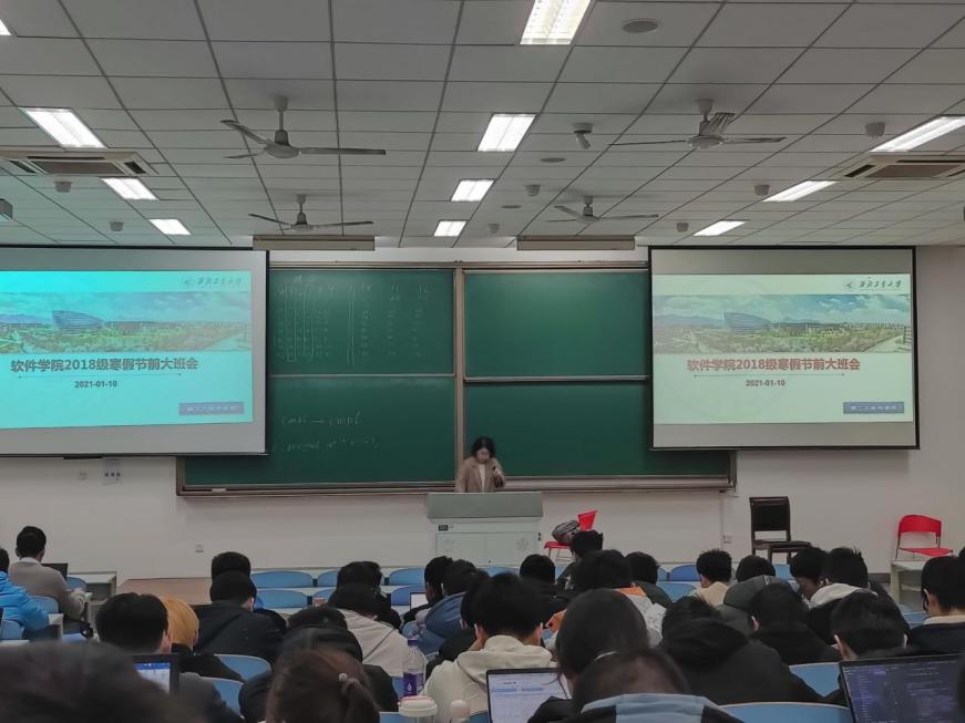 组织2018级本科生在教学西楼D201召开了寒假节前大班会。出席会议的有辅导员齐春晓和2018级全体本科生。