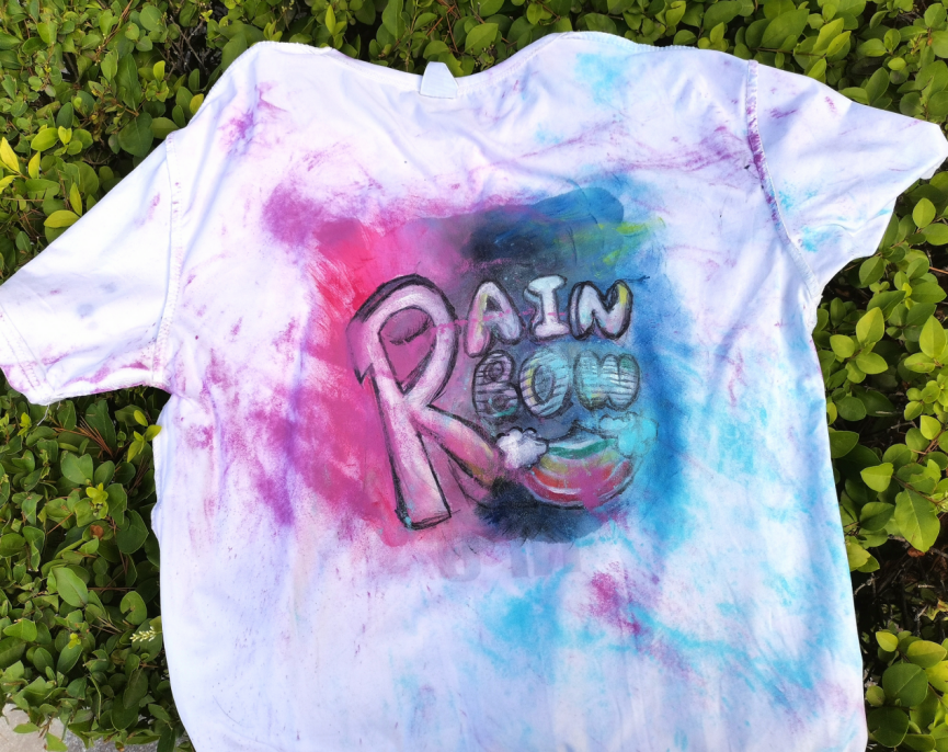 色彩与活力的碰撞,用涂鸦风格诠释最合适不过了。这幅DIY是我第一次尝试在衣服上用颜料模仿涂鸦墙。虽然这只是新手的一次尝试,还有很多不完美的地方,但是高饱和度的颜色代表了我对彩虹跑的理解——热情、自由。这是一项人人都可以参与的活动,也代表了我们永远不会逝去的青春