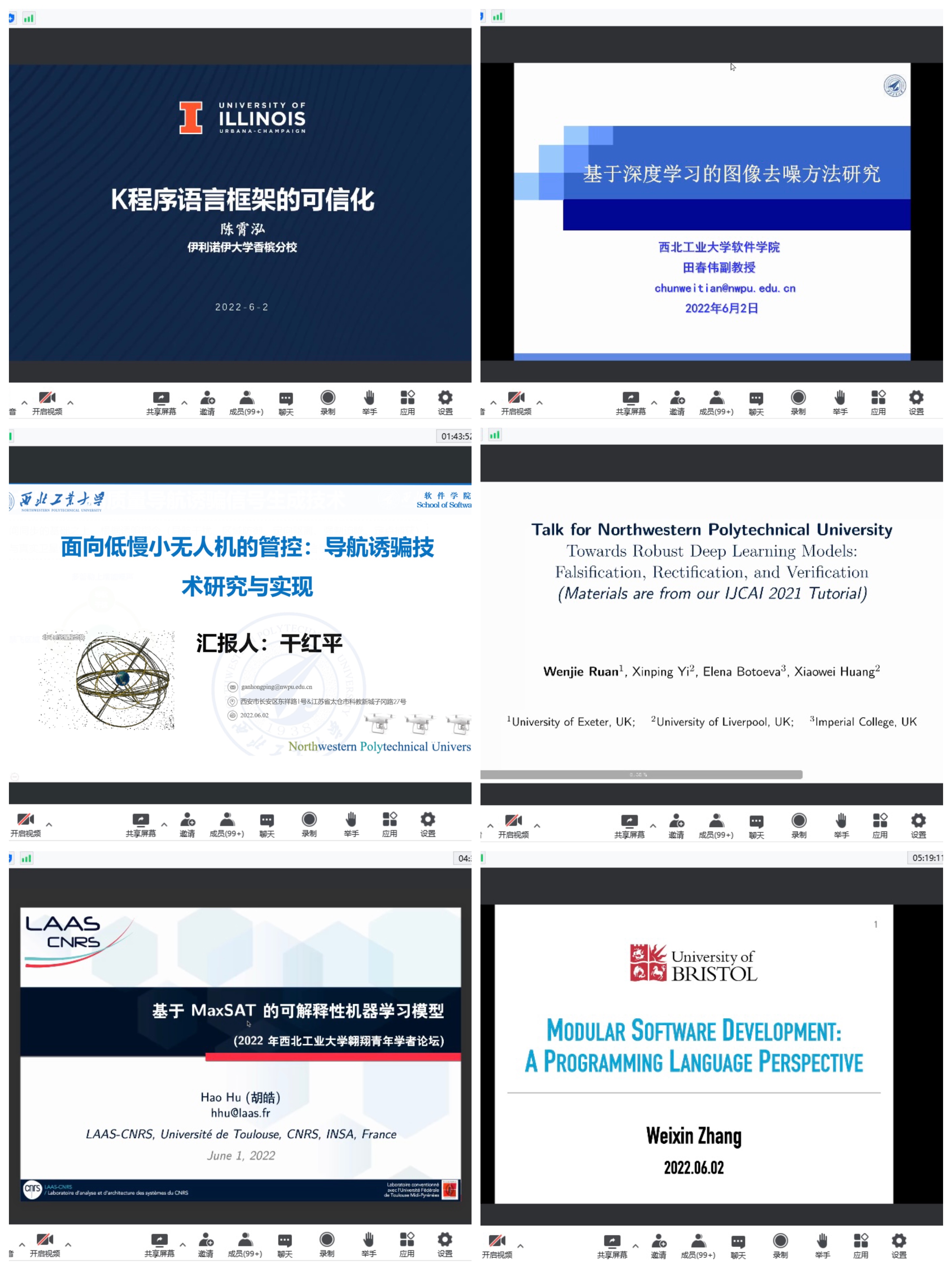 干红平副教授作了《面向低慢小无人机的管控:导航诱骗技术研究与实现》的报告,其中高质量导航诱骗信号生成技术等关键技术令人印象深刻;英国埃克塞特大学的阮文杰博士作题为《深度学习鲁棒性分析》的报告,并分享其在研课题及未来研究方向;法国国家科学研究中心系统与体系分析实验室的胡皓博士从最优决策树、最优二元决策图方向报告了《基于MaxSAT的可解释机器学习模型的研究》;英国布里斯托大学的张炜昕博士做了《模块化软件开发:编程语言视角》的报告。