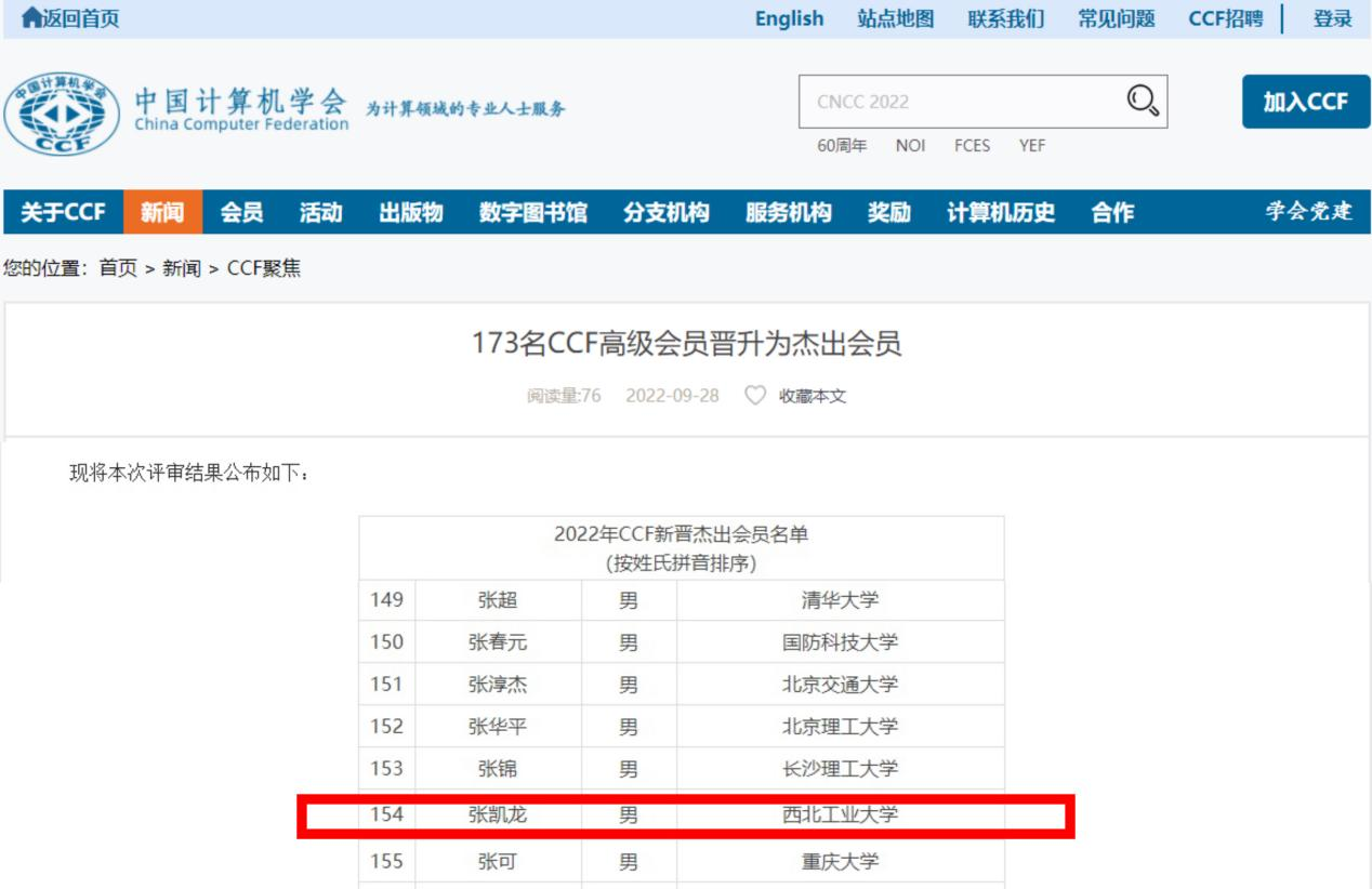 张凯龙教授名列其中,CCF评审委员会高度评价了张凯龙教授的专业造诣和长期以来对CCF发展的贡献。