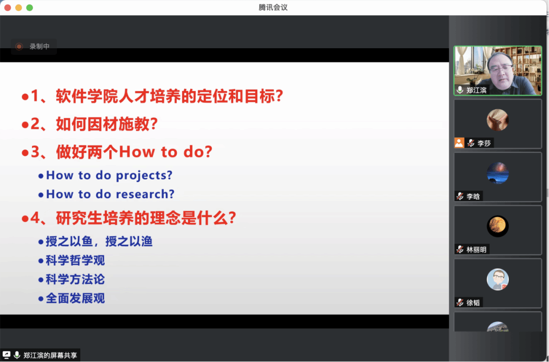 应培养懂行业、懂专业,具有思辨能力的人才,导师要帮助学生学习了解其学科体系、行业知识,同时培养学生的思辨能力及创新能力,使学生成为一个“专而广”综合人才。结合学院的人才培养定位和目标,郑江滨总结,导师应了解学生的知识体系和天资,因材施教,挖掘其潜能;导师应该教会学生如何做项目、如何做研究,关注学生实践能力的培养;导师更应该关注学生身体健康,引导学生德智体美劳全面发展;同时关注学生“面向生活、面向困难”情商的培养。最后,郑江滨引导导师“授之以鱼,授之以渔”,结合科学哲学观、科学方法论及全面发展观等研究生培养理念培养人才,使之全面发展。