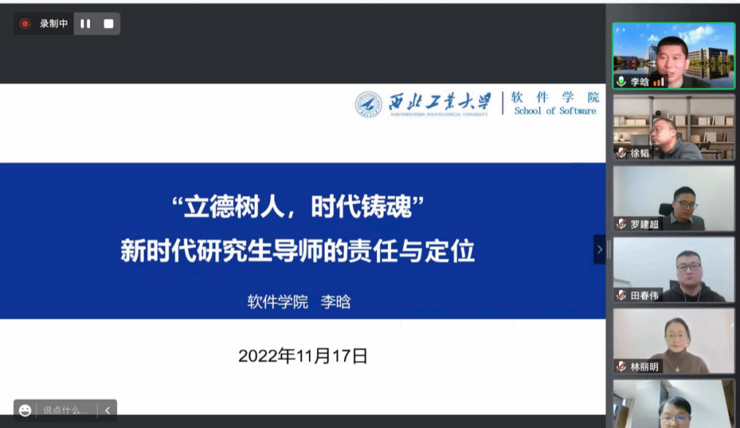 李晗首先作了题为“立德树人,时代铸魂—新时代研究生导师的责任与定位”的主题党课。带领全体导师深入学习习近平总书记在党的二十大报告中有关教育的重要讲话精神和全国研究生教育会议的重要精神和批示,围绕党的二十大中提出的“实施科教兴国战略,强化现代化建设人才支撑”及研究生教育会议提出的“坚持‘四为’方针,加快培养国家急需的高层次人才”,详细解读了自2020年全国研究生教育大会至2022年党的二十大举办以来教育部及学校出台的相关会议和文件精神。随后,李晗通过对于《关于全面落实研究生导师立德树人指责的意见》《关于加强博士生导师岗位管理的若干意见》《研究生导师指导行为准则》《西北工业大学研究生导师指导行为准则》等教育部及学校出台的各项文件政策的解读,提出了更高层次的要求:导师应坚持立德树人,价值引领,做研究生价值塑造的引路人;导师既要做学生的学业导师,又要做其人生导师。鼓励培养担负民族复兴大任的时代新人,在服务教育强国的征程中,展现自身的担当和作为。