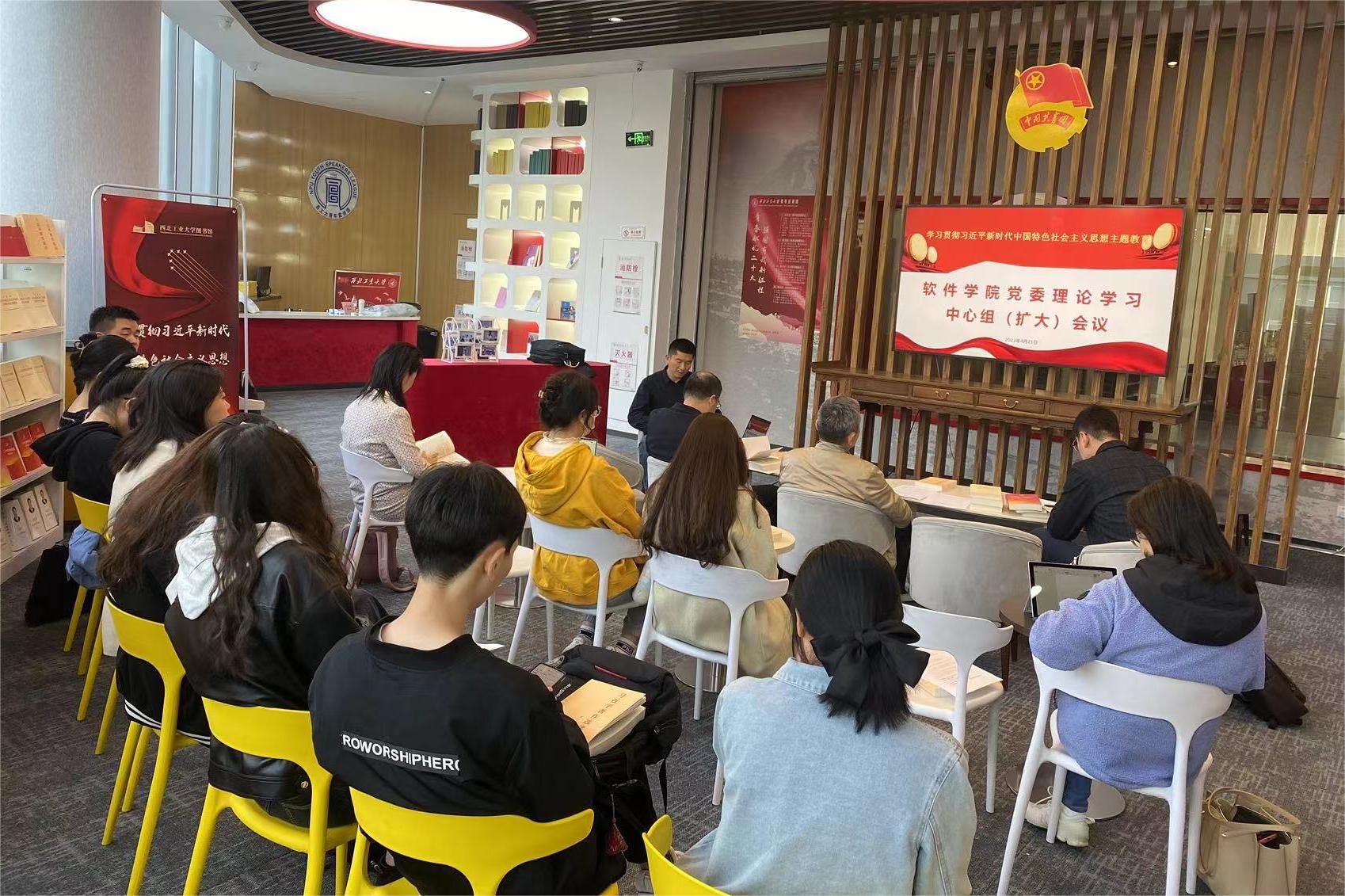 在书屋读原文。书屋墙壁悬挂着“入党誓词”以及主题教育解读展板,书架上摆放了《习近平著作选读》(第一卷、第二卷)《习近平新时代中国特色社会主义思想学习纲要(2023年版)》等多种主题教育读物,营造出主题教育的浓厚氛围。学院院长郑江滨与党委副书记(主持)李晗分别领读了《习近平著作选读》第一卷中的《实现中华民族伟大复兴是中华民族近代以来最伟大的梦想》与《人民对美好生活的向往,就是我们的奋斗目标》,与参会人员一同认认真真读原著,学原文、悟原理。