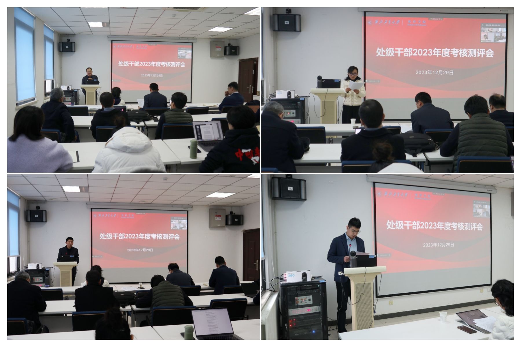 于12月29日召开全体教职工大会暨处级干部考核测评会。学院领导班子成员以及全体教职工、部分学生代表参加会议,部分教师线上参会。会议由学院党委书记李晗主持。