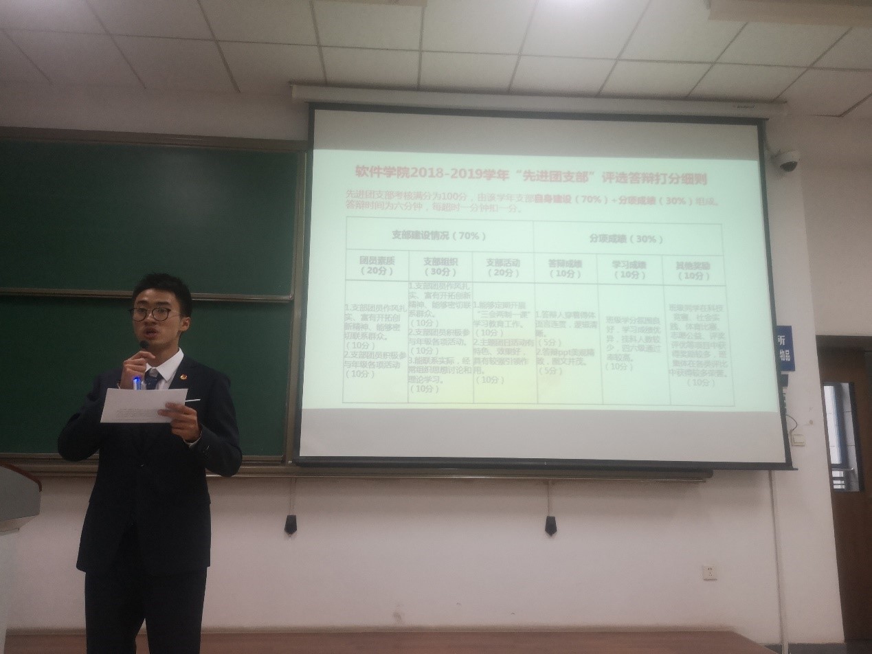 党委副书记张琨老师,团委书记、2017级本科生辅导员陈智通老师, 2018级本科生辅导员樊超老师以及研究生辅导员张桐老师出席本次大会并为参与答辩的团支部进行审核评分。